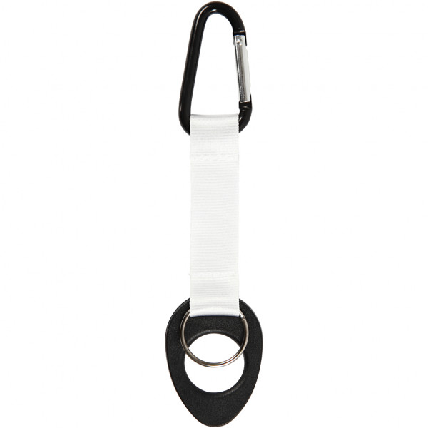Bottle holder in polyester with key ring and strong carabin lock, to attached to the belt or on the backpack. Decorated easily with textile noise, stamp pressure and the like.