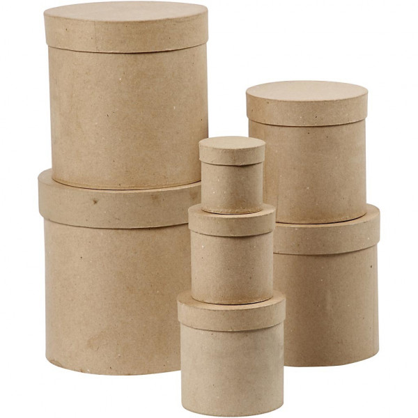 Set ronde, handgemaakte dozen van bruin papier-maché.