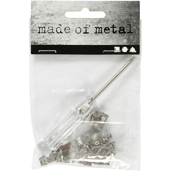 Set met 10 haken, 20 bijpassende schroefjes en 1 schroevendraaier.