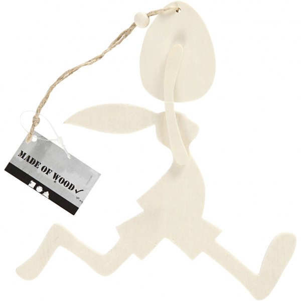 Rabbit with eggs in light wood. Mounted with natural cord for suspension.