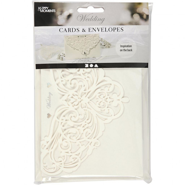 Zowel kaart als envelop hebben een parelmoer oppervlak, losse inleg is van wit papier (120 gr).