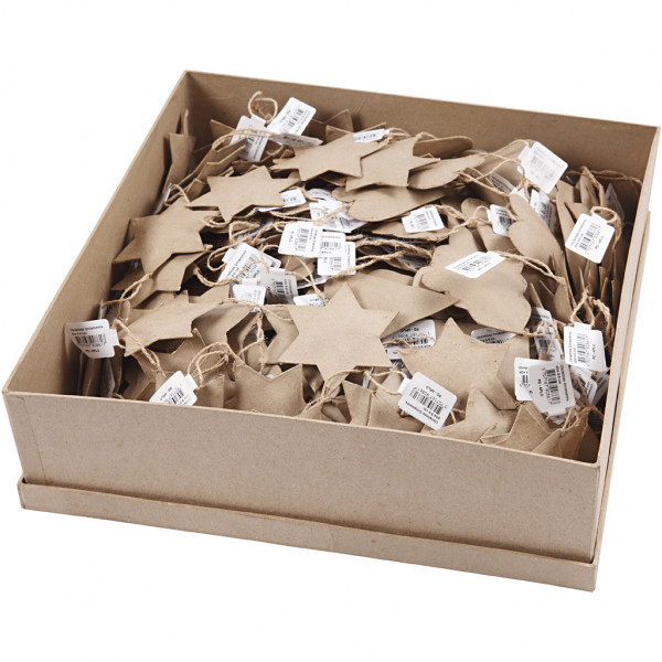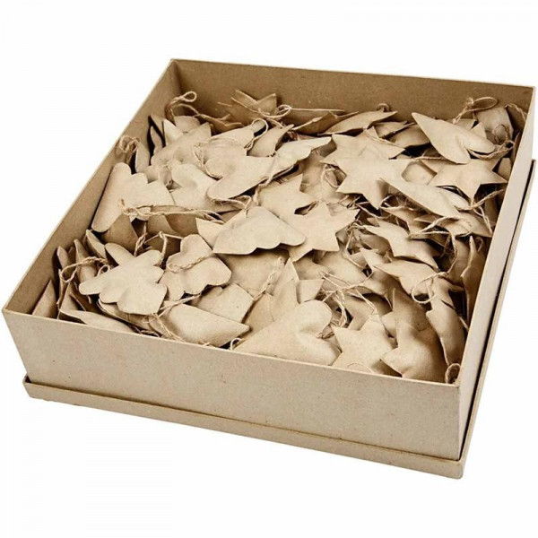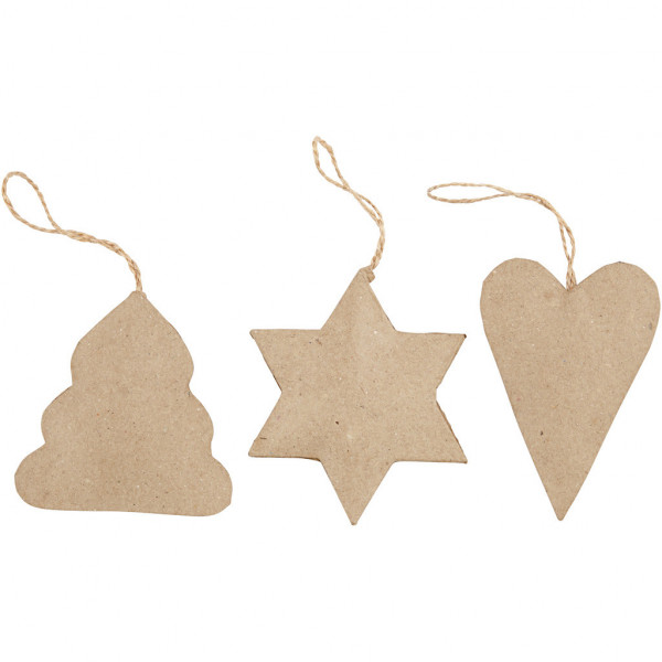 Kerstdecoraties van papier-maché met ophanglus van jute.