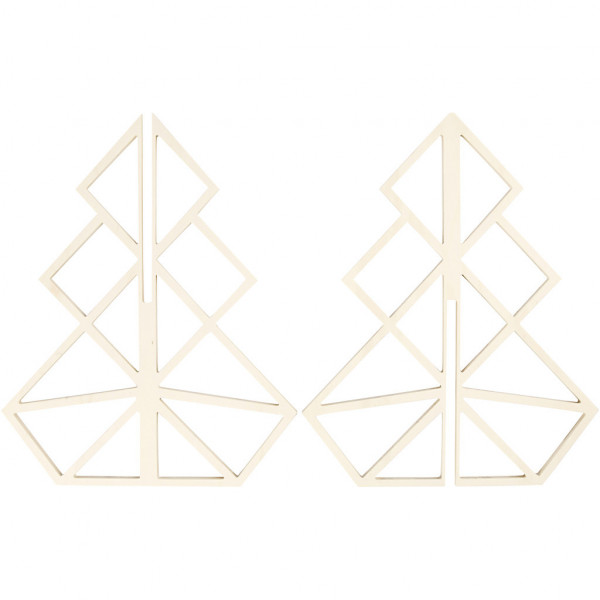 Kerstboom in geometrisch design van licht, 3 mm dik hout, bestaande uit twee delen met sleuf.