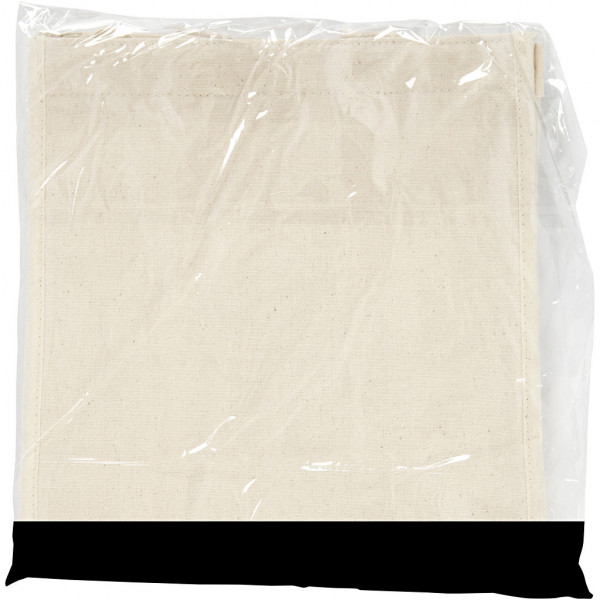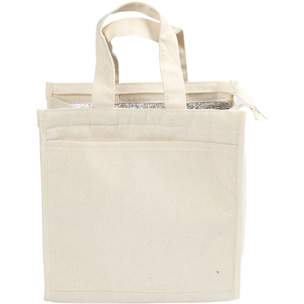 Kleine koeltas met hengsels en rits. De buitenkant en de zak zijn van katoen (220 g/m²) en kunnen worden gedecoreerd met bijvoorbeeld textielstiften of textielverf. De binnenkant is bekleed met isolerend folie.