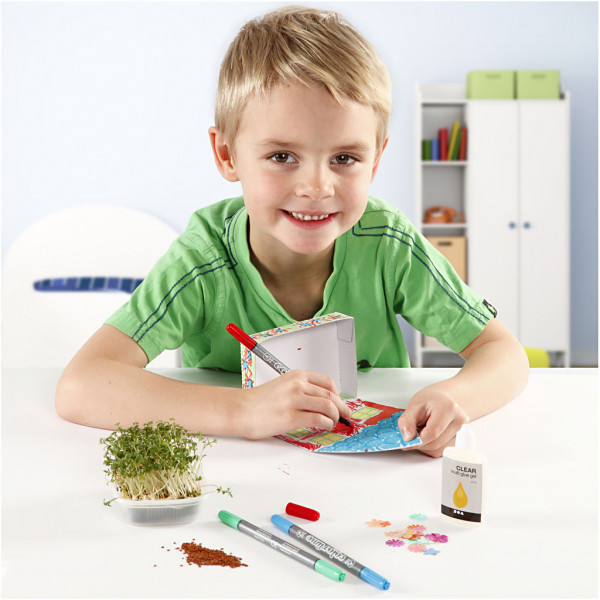 Inhoud: 24 plastic bakjes, 8 zakken met waterkerszaadjes, 12 pakken Colortime stiften, bloempailletten en 6x Clear Multi Glue Gel.