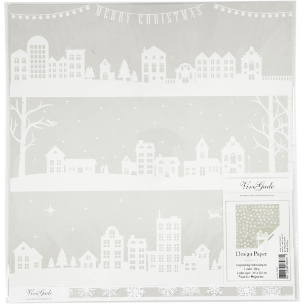 Design papier, vel 30,5x30,5 cm,  180 gr, huizen en sneeuwvlokken, 3vellen [HOB-25344]