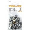 Ronde, metalen eyelets van Fiskars. Makkelijk te bevestigen met een eyelet setter.