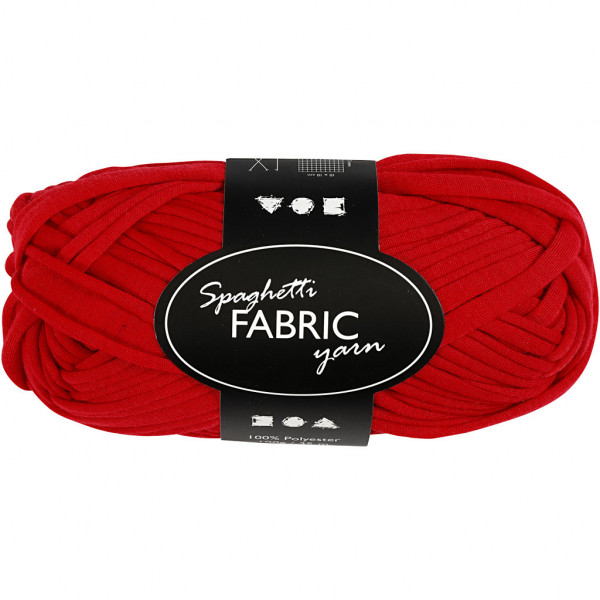 Spaghettigaren gemaakt van stof van 100% polyester. Bijzonder geschikt voor het breien en haken van kussens, dekens, tassen, etc. 11 steken x 16 steken = 10 x 10 cm op naald 7-8. Wasbaar op 30°C.