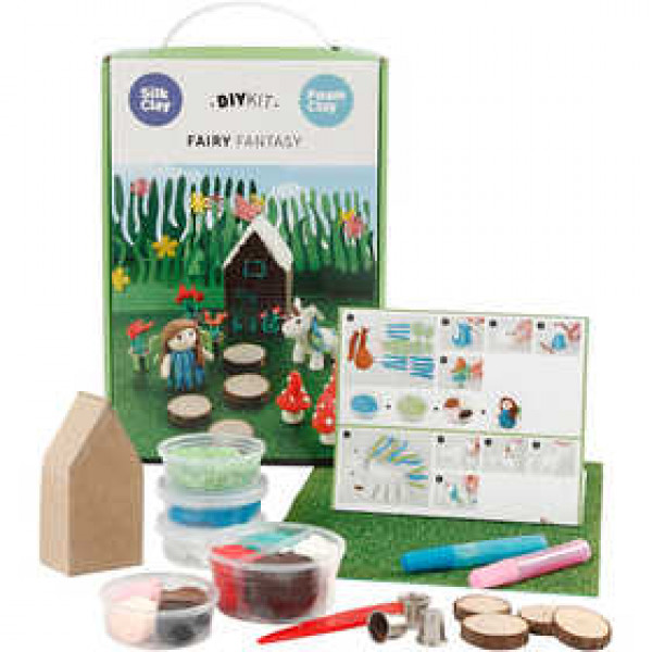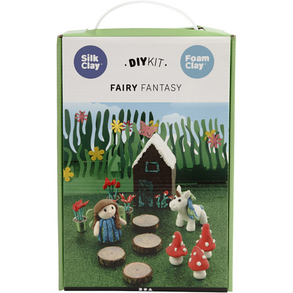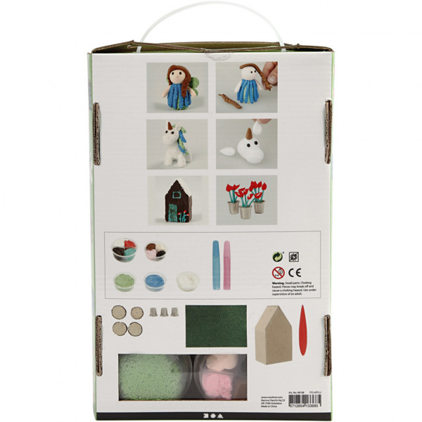 Inhoud: Foam Clay en Silk Clay in diverse kleuren voor de feeën, eenhoorn en de paddestoelen. Plus glitterlijm, kleine houten schijven, glitter foam plaat voor de ondergrond van het bos en vingerhoedjes als potten en een huis van papier-maché.