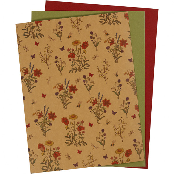 Faux Leather Paper, sheet 21x27.5+21x28.5+21x29.5 cm, thickness 0.55 mm, 3 sheets, green, natural, red [HOB-498835]