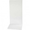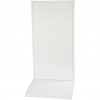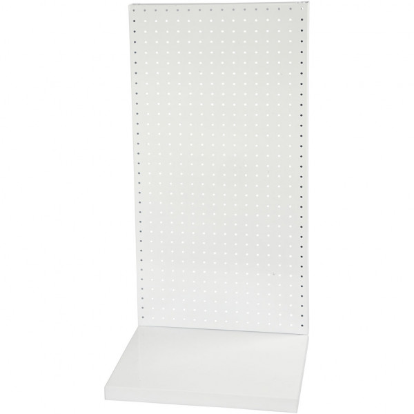 Robuust en flexibel display systeem van wit metaal met geperforeerde platen, L-basis en basis plank.