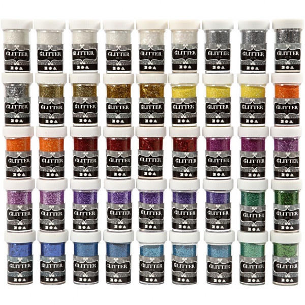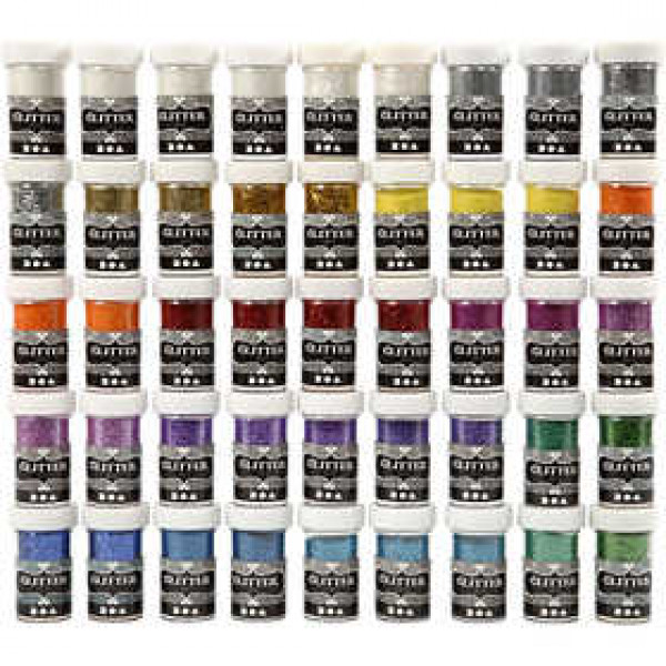 Fantastisch assortiment glitter in veel verschillende kleuren.