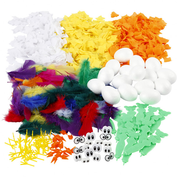Materialenset voor het maken van 16 kuikens door het vastprikken van gele stof op styropor. Inclusief ogen, snavels en plastic voeten en een prikgereedschap van plastic.