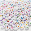 Ronde kralen met het alfabet en cijfers. Gemaakt van wit plastic met gekleurde opdruk op de platte voor- en achterkant. Eén teken in verschillende kleuren per kraal.
