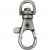 Karabijnsluiting van metaal met een draaier die 360 graden op kan terwijl de sluiting stil blijft.