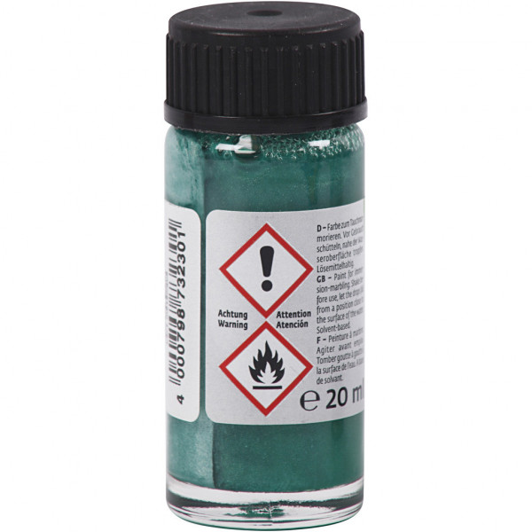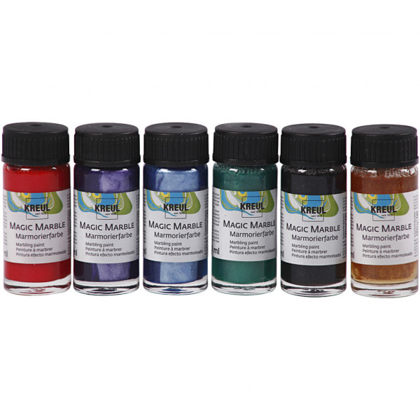 Set met 6 kleuren van elk 20 ml. Instructie: Schud de verf. Doe water in een kom. Druppel wat verf voorzichtig in het water. Vermeng de verf voorzichtig met een stokje, zodat de kleuren marmeren. Doop het object voorzichtig in het water. Laat drog.