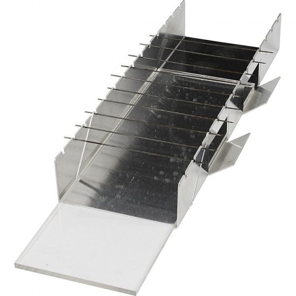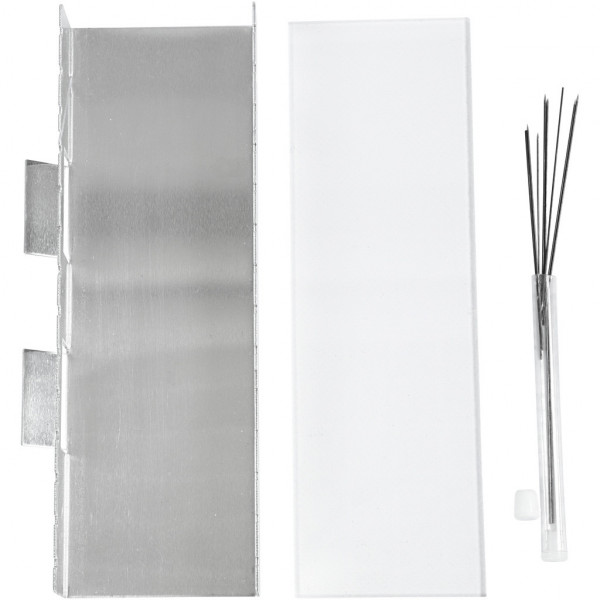 Inhoud: rek van roestvrijstaal met inkepingen, acryl schijven, acryl plaat en 12 kralen pinnen.