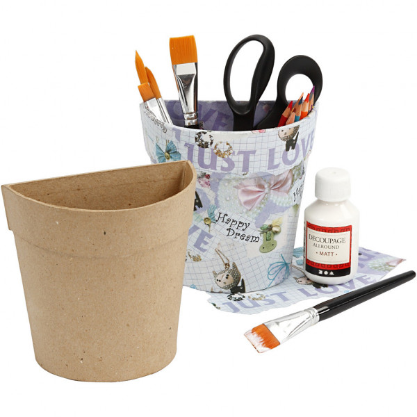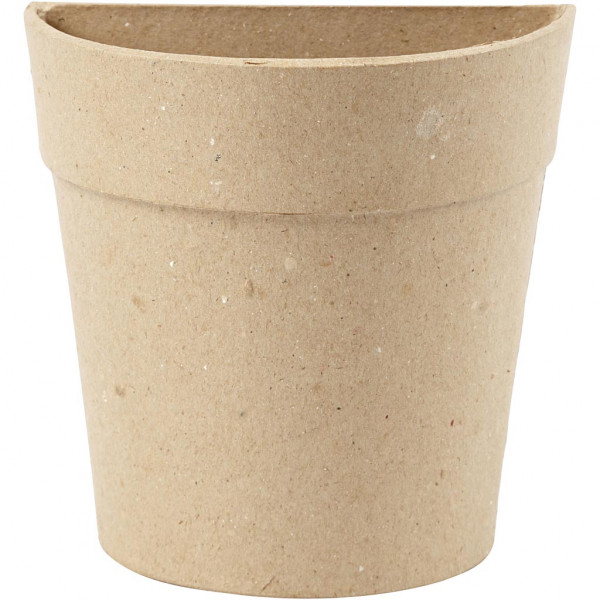 Halfronde pot voor aan de muur van papier-maché. Achterkant is plat.