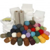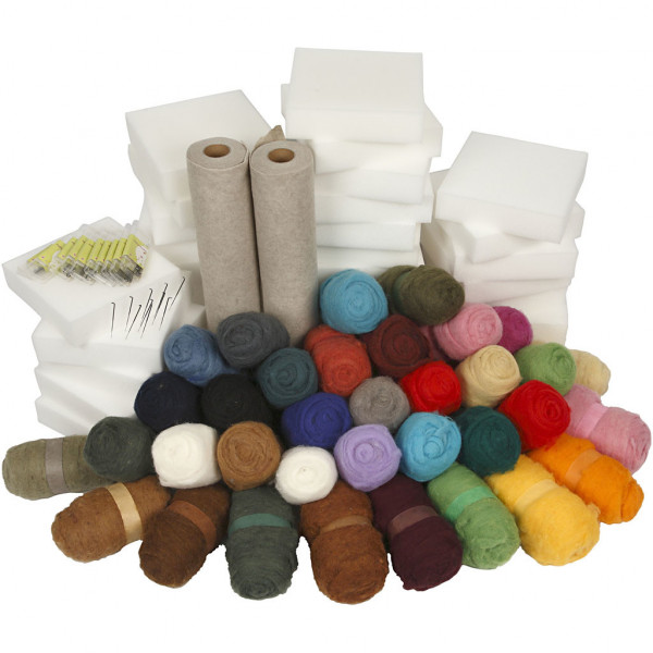 Inhoud: 35x100 gr gekaarde wol, 30 naaldvilten foam pads, 100 viltnaalden, 2 rollen off-white vilt 45 cm x 5 m.