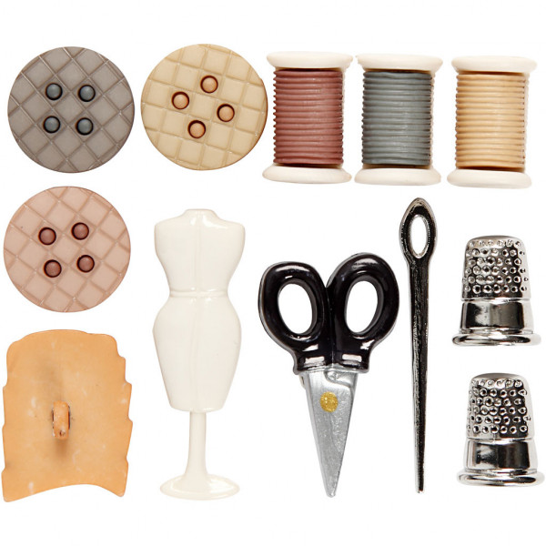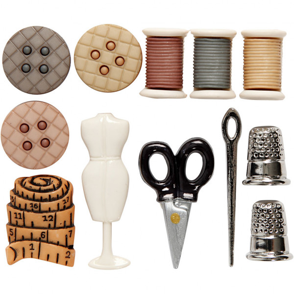 12 x sewing-themed novelty-shaped plastic buttons.