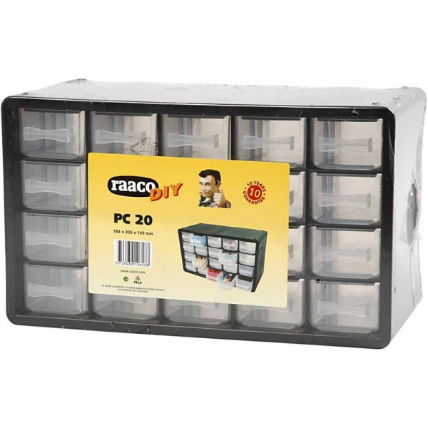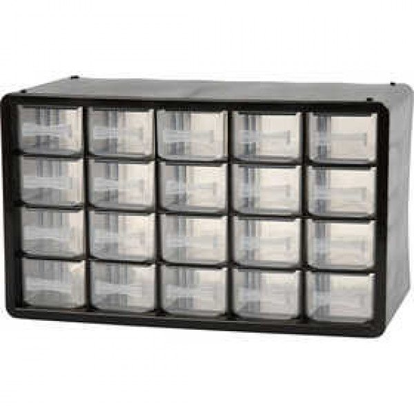 Opbergsysteem van stevig, duurzaam plastic met 20 lades - stapelbaar.