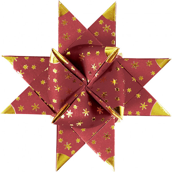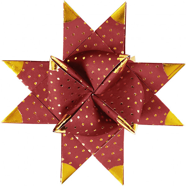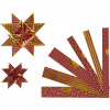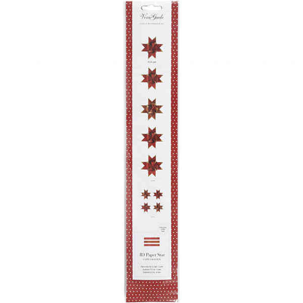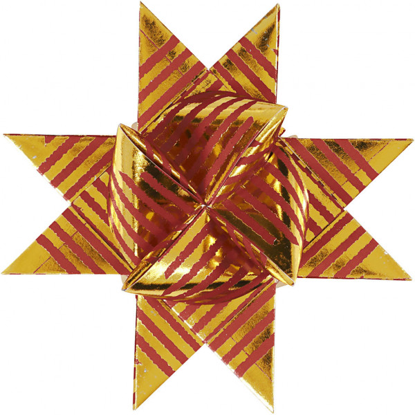 Traditionele papieren stroken van Vivi Gade. De stroken hebben aan beide kanten dezelfde kleur met patronen met deels folie, zodat elke gevouwen ster goud lijkt. De diameter geeft de afmeting van de kant-en-klare ster aan.