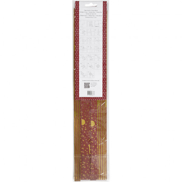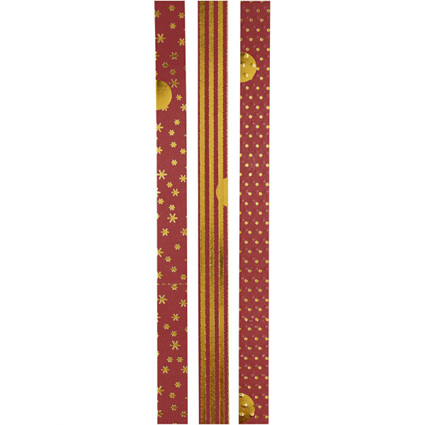 Papieren vlechtstroken, b: 15+25 mm, d: 6,5+11,5 cm, goud, rood, metallic punten, 48stroken, l: 44+78 cm [HOB-22561]