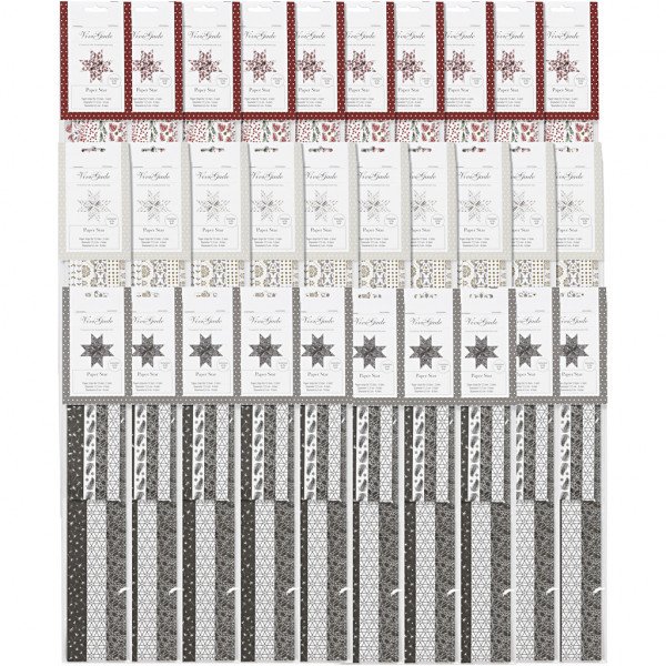 Assortiment twee-dimensionale multikleurige papieren vlechtstroken met een design van Vivi Gade met drie collecties in 4 designs dubbelzijdig bedrukt en details van glanzend metaalfolie. Diameter geeft de maat van de kant-en-klare ster aan. Incl.