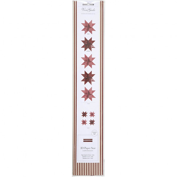 Dubbelzijdige papieren stroken in twee verschillende maten van Vivi Gade Design. Diameter geeft maat van de ster aan. Inclusief instructie.