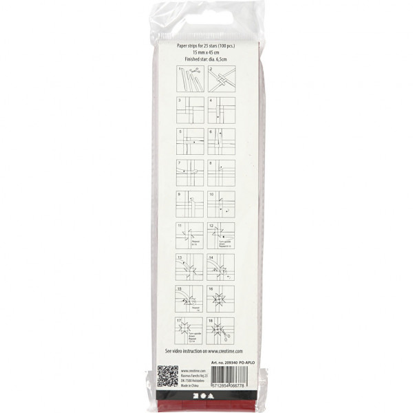 Traditionele papieren vlechtstroken voor het maken van gevouwen sterren. De diameter geeft de maat van de gevlochten ster aan. Inclusief instructies.
