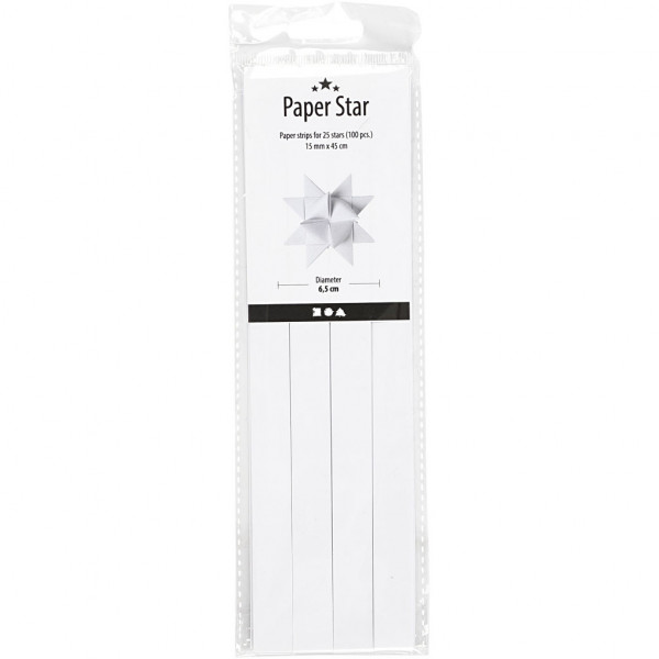 Traditionele papieren vlechtstroken voor het maken van gevouwen sterren. De diameter geeft de maat van de gevlochten ster aan. Inclusief instructies.
