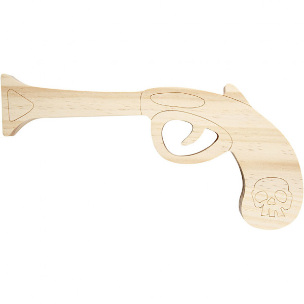 Pistool van licht hout met gestempelde details aan beide zijden, die kunnen worden geschilderd.