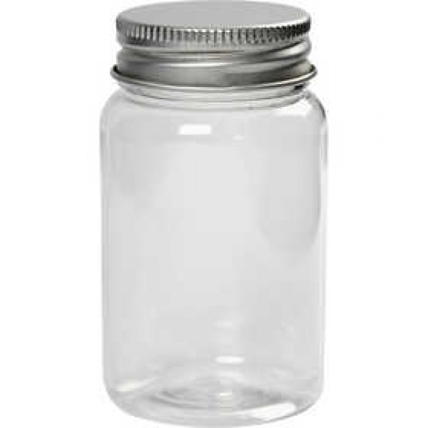 Transparant plastic potje met metallic grijze schroefdop.