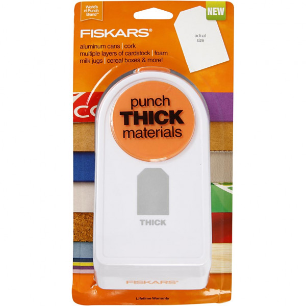Zeer sterke pons van Fiskars. Ponst door aluminium, hout fineer (max 1 mm), kurk (max. 1 mm), kunstleer (max. 0.9 mm), ribbelkarton (max. 1.38 mm), karton (max. 2.4mm en EVA foam (max 1.5mm).