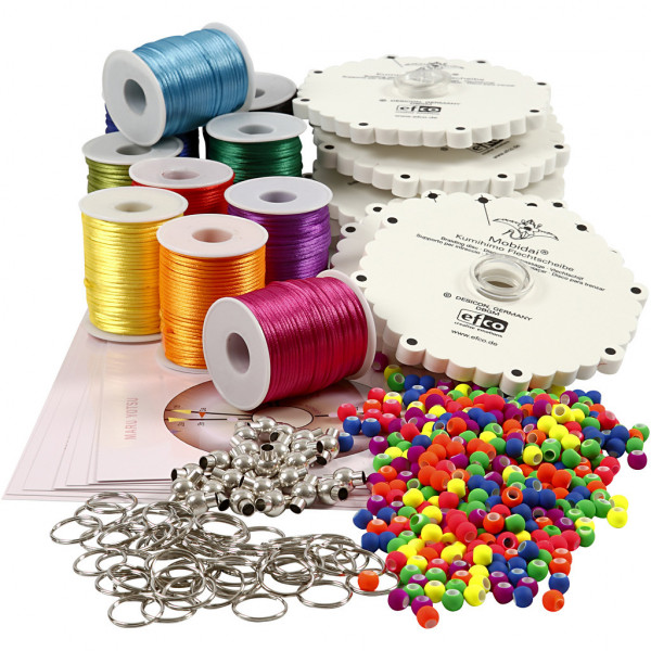 Inhoud: 8 Kumihimo vlechtschijven, 10 patroonschijven / 2 designs, 10x50m macramé koord, 100 sleutelringen, 24x magnetische sluitingen en link kralen.
