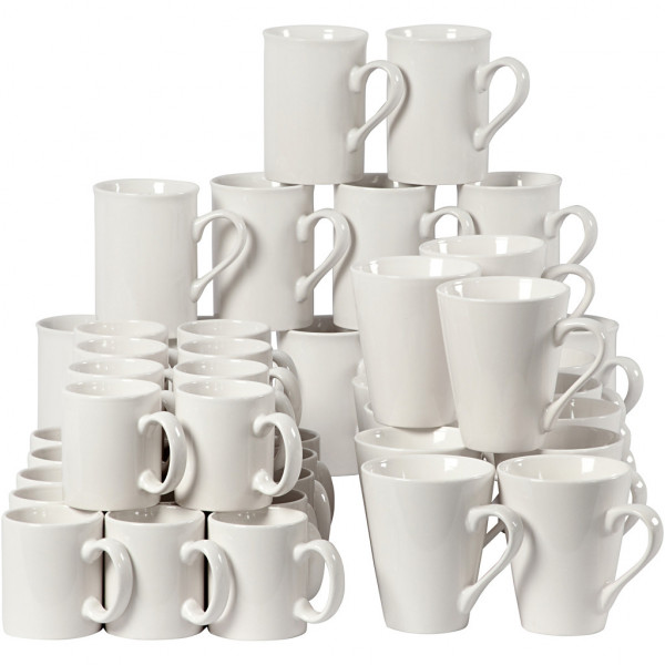 Contains 48 White mugs in 4 different shapes.