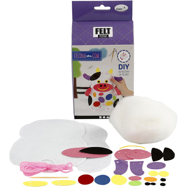 Inhoud: 1 figuur van hobbyvilt en zelfklevende decoraties van vilt, vilt om te naaien, vulling, naald en garen. Instructies op de verpakking.