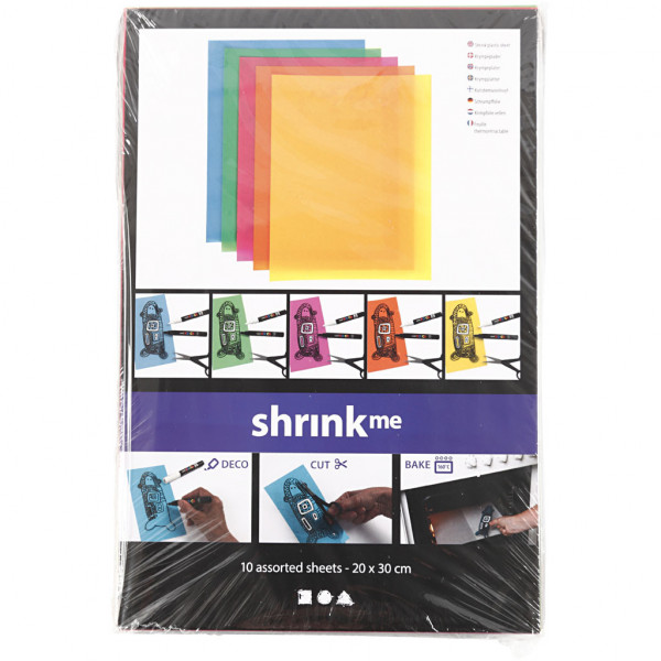 Deze vellen hebben zowel een matte als een glanzende kant. Zodra deze in een huishoudoven wordt verwarmd krimpt het plastic tot 40% van de originele grootte. Decoreer aan de matte kant met potloden en met permanente stiften aan de glanzende zijde.