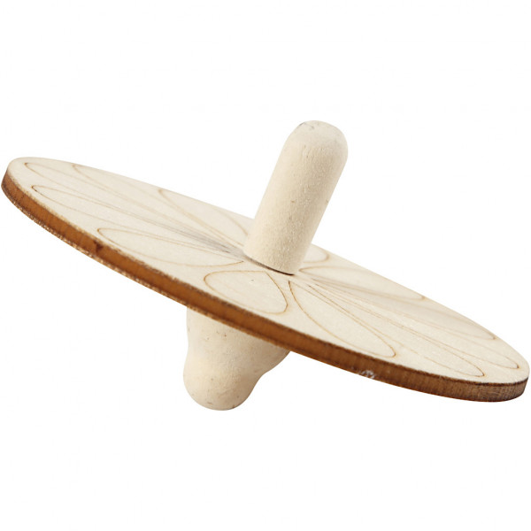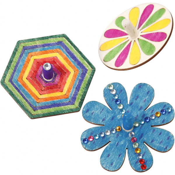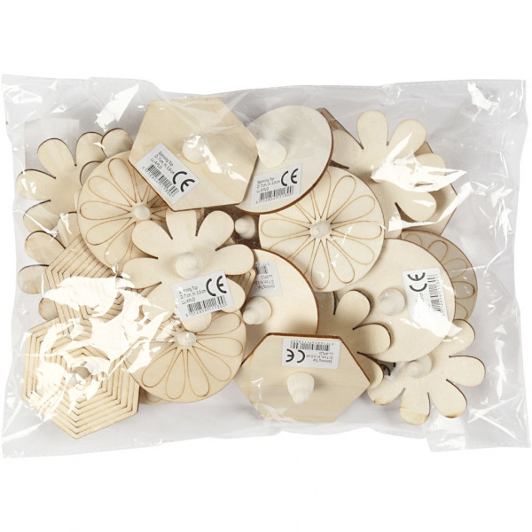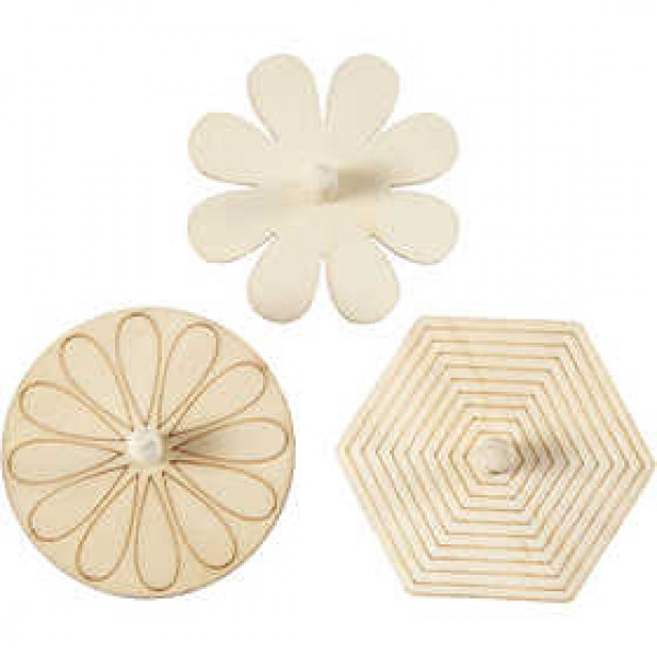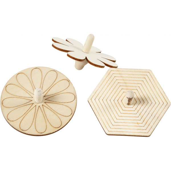 Tollen in 3 verschillende modellen (rond, zeskantig, bloem) van licht hout. De ronde en de zeskantige tol hebben details aan de bovenkant.