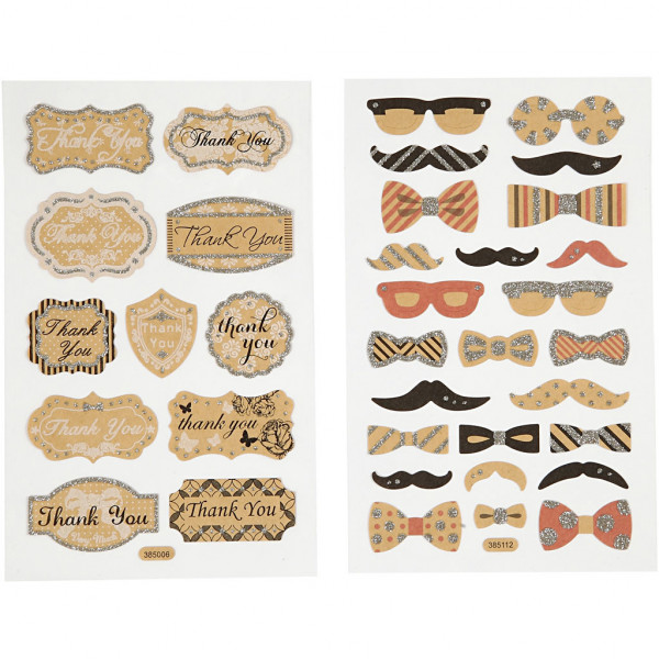 Stickers, vel 10x16 cm, brillen, snorren en 'Thank you' labels, 4vellen [HOB-29102]