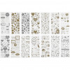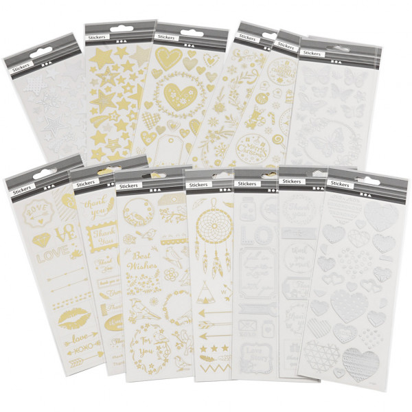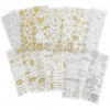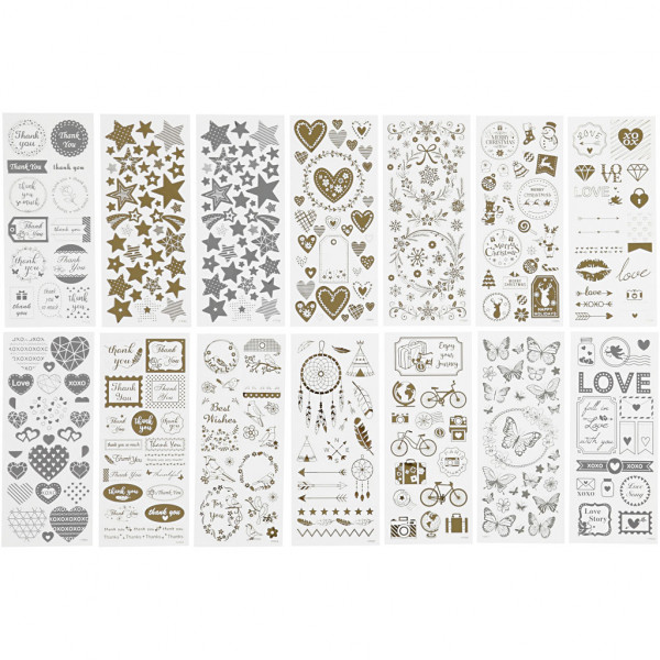 Assortiment zelfklevende stickers met motieven in zilver of goud folie op dun, transparant plastic folie.