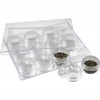 Set van 12 individuele opslag doosjes met schroefdop in een plastic doos.