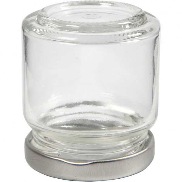 Transparante glazen pot met schroefdeksel van zilverkleurig metaal.