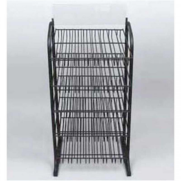 Zwart gelakt constructie met 5 schuine draadschappen.