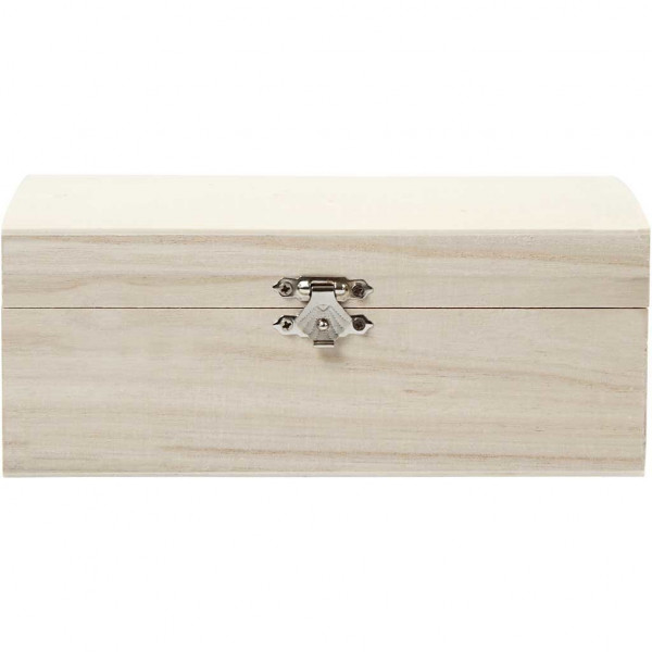 Kist van hout met rond deksel en metalen sluiting.