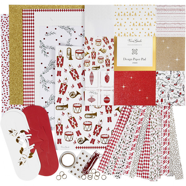 Inhoud: 2 vel wit karton, 2 vel glitterpaier, 1 vel vellum, 4 vellen design papier, 4 sets gevlochten harten, 48 papieren sterstroken, 3m waxkoord, 15 splitringen in goud en met strassteen.