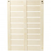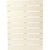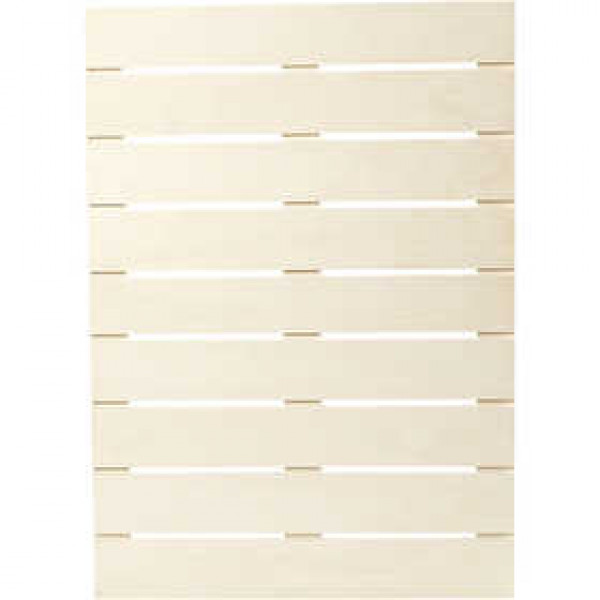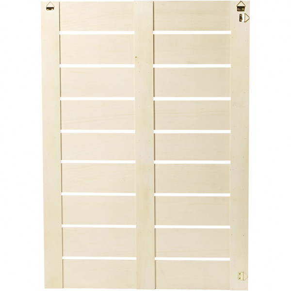 Paneel van latten hout, uitgerust met haken voor zowel verticale als horizontale ophanging.