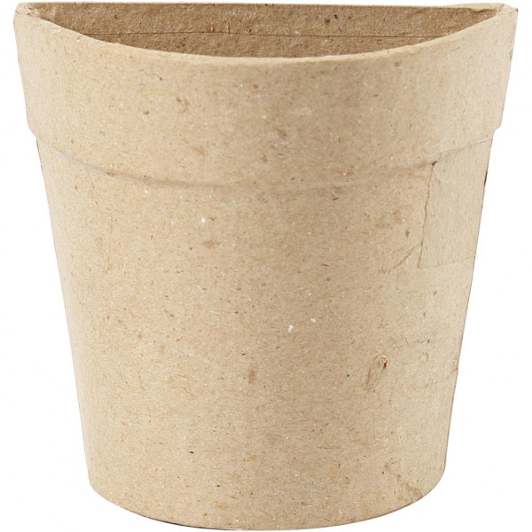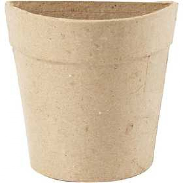 Halfronde pot voor aan de muur van papier-maché. Achterkant is plat.